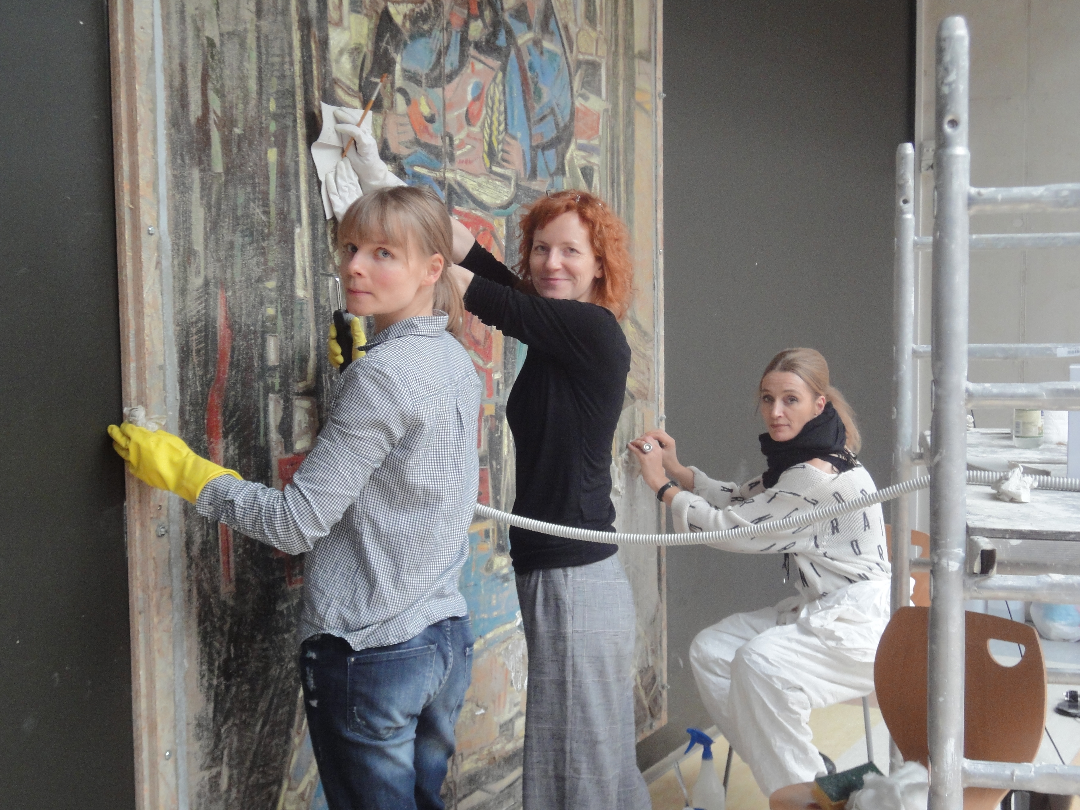 Õnneks saame rääkida projekti kolmandast faasist – maalingu taaseksponeerimisest arhitektuurses keskkonnas – oma kolmanda sarnase projekti puhul. 2015. aasta mais eemaldasime Vana-Võidu mõisa nõukogudeaegsest, lammutamisele määratud juurdeehitisest Elmar Kitse viimase pannoo – tegemist oli taas hästi läbi komponeeritud reljeefse maalinguga. See sai ka esimeseks maalinguks, mis leidis tee uuele seinale. Tänaseks võime öelda, et riskantne ja tehniliselt keerukas ettevõtmine on väga hästi õnnestunud ja maaling on täies hiilguses Viljandi Kutseõppekeskuse uues õppehoones eksponeeritud. Jääme ootama, millal saame EKA uue hoone seintele “kleepida” ka meie vana õppehoone maalingud!