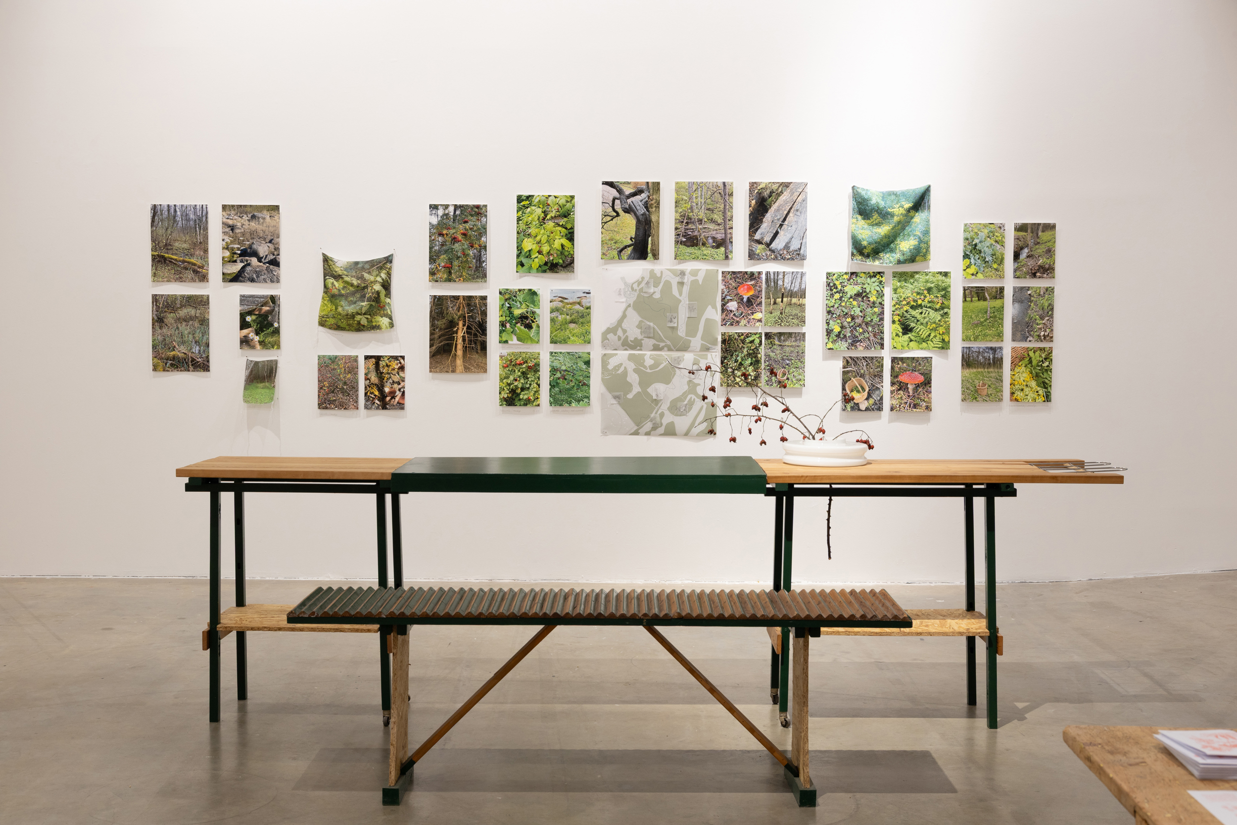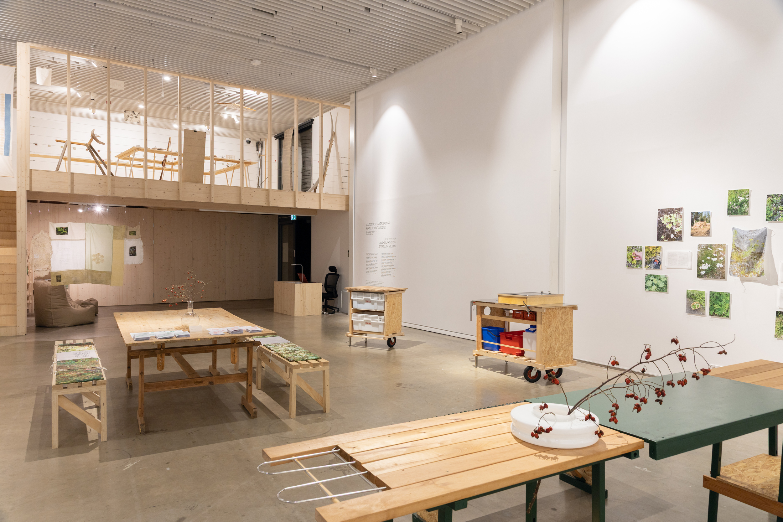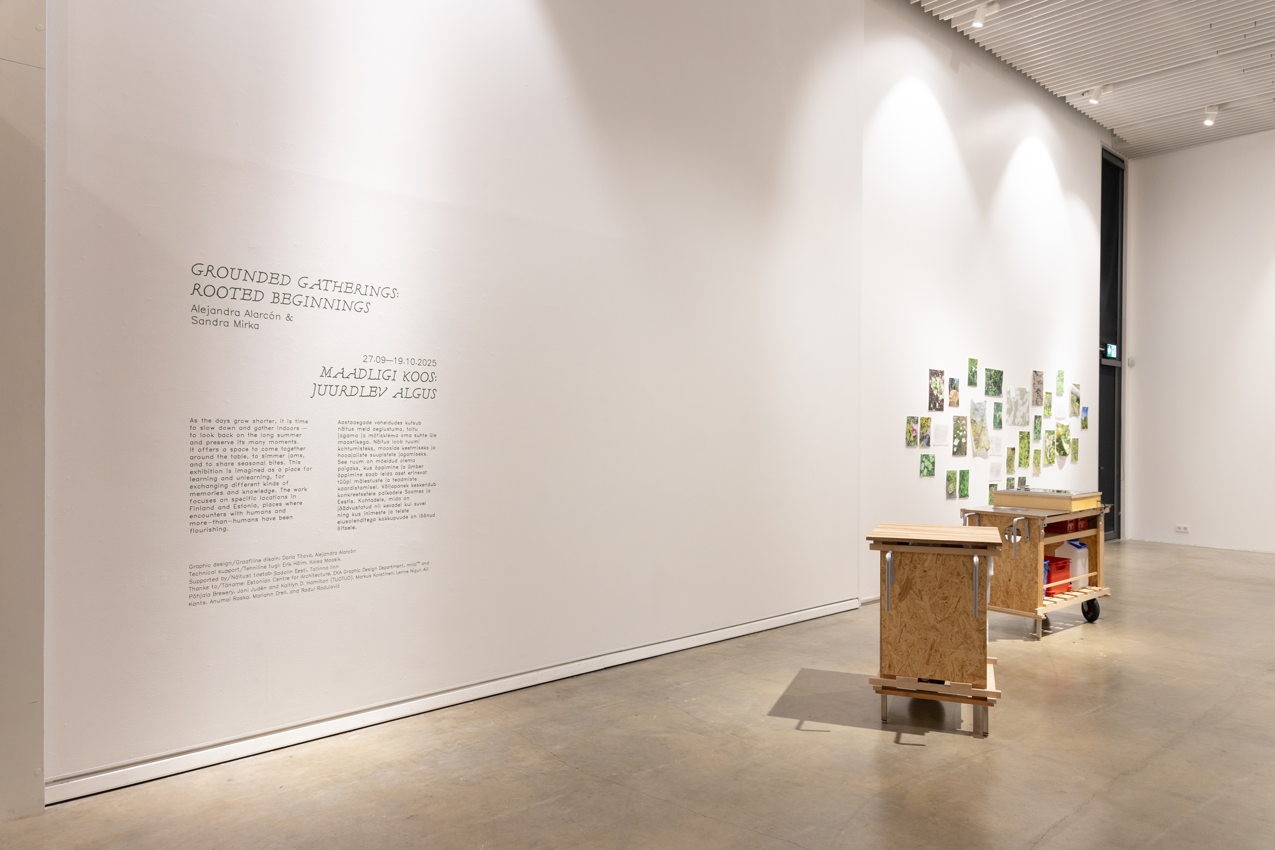 Aastaaegade vaheldudes kutsub näitus „Maadligi koos: juurdlev algus“ meid aeglustuma, toitu jagama ja mõtisklema oma suhte üle maastikega. Näitus loob ruumi kohtumisteks, mooside keetmiseks ja hooajaliste suupistete jagamiseks. See ruum on mõeldud olema paigaks, kus õppimine või ümber õppimine saab leida aset erinevat tüüpi mälestuste ja teadmiste kaardistamisel. Väljapanek keskendub konkreetsetele paikadele Soomes ja Eestis. Kohtadele, mida on jäädvustatud nii kevadel kui suvel ning kus inimeste ja teiste elusolenditega kokkupuude on löönud õitsele. Projekt kutsub publikut üles looma ja hoidma pikaajalist suhet oma ümbrusega läbi arendatud retseptide, töötubade ja ühiste söömingutega.