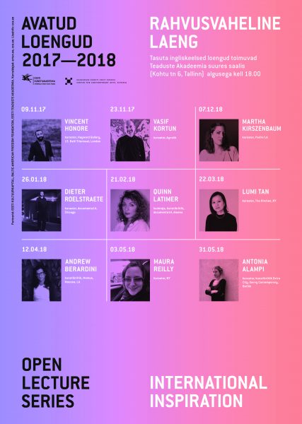 Koostöös Kaasaegse Kunsti Eesti Keskusega korraldame 2017-2018 aastal avatud loengusarja “Rahvusvaheline laeng / International inspiration”, millega tähistame kuraatori õppesuuna avamist meie magistriõppes. Loenguseeria raames kutsume Tallinna rahvusvaheliselt tunnustatud kuraatoreid ja kriitikuid, kes tutvustavad oma praktikaid, töömeetodeid ning jagavad seminarides nõuandeid väljal alustavatele tudengitele. Iga kõneleja peab avatud loengu ning väiksema seminari EKA tudengitele.