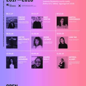 Sarja raames käisid sügissemestril Tallinnas 13. Balti Triennaali kuraator Vincent Honoré (9.nov), kuraator Vasif Kortun (23.nov) ja Prantsuse-USA feministlik kuraator Martha Kirszenbaum (7.dets). Kevadsemestril tulevad documenta14 kuraator Dieter Roelstraete (26. jaan), luuletaja ja kunstikriitik Quinn Latimer (21. veeb), kuraator Lumi Tan (22.märts), kunstikriitik Andrew Berardini (12.aprill), feministlik kuraator Maura Reilly (3. mai), kuraator ja kriitik Antonia Alampi (31. mai). Üritust toetavad Eesti Kultuurkapital, Baltic-American Freedom Foundation, Eesti Teaduste Akadeemia.
