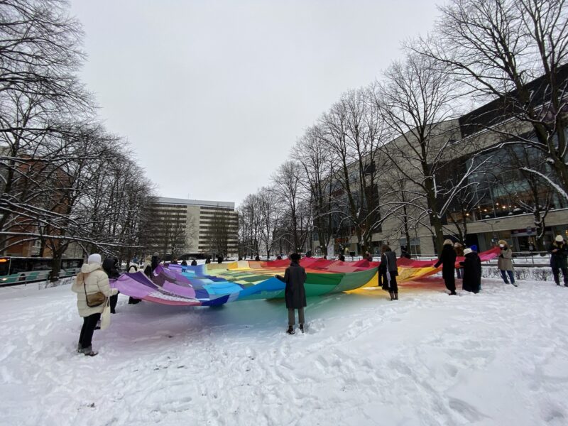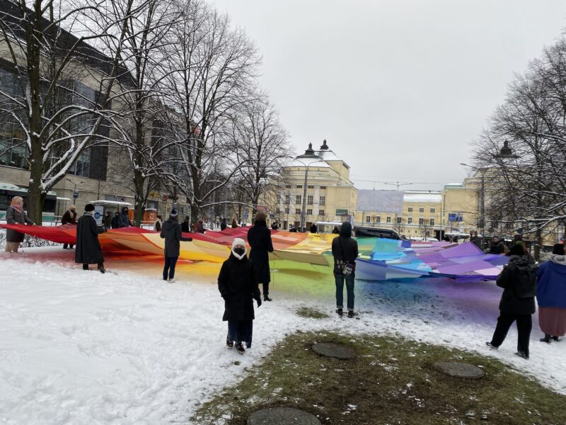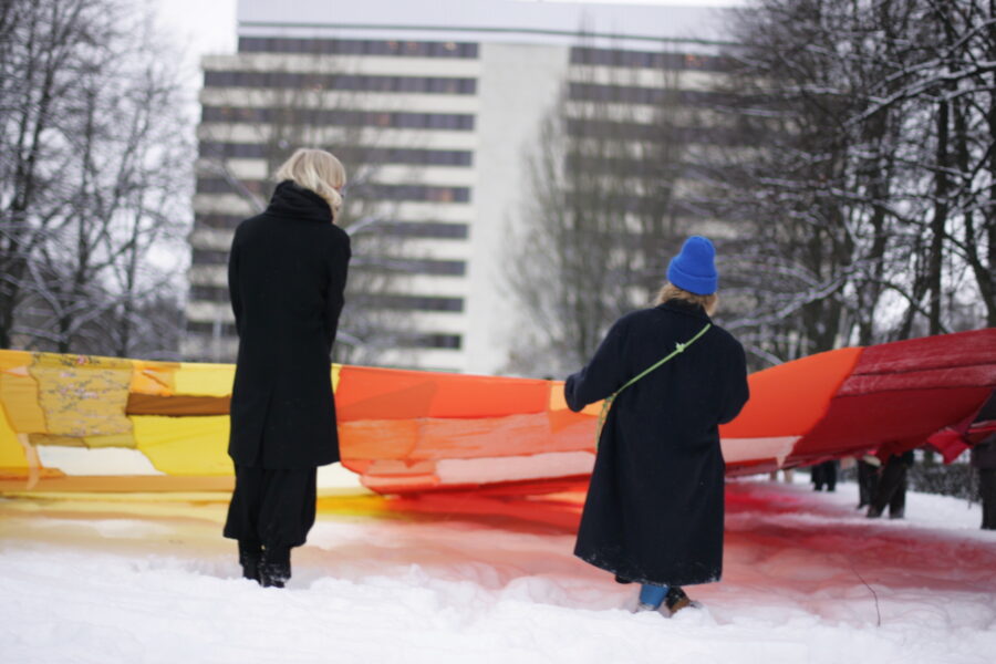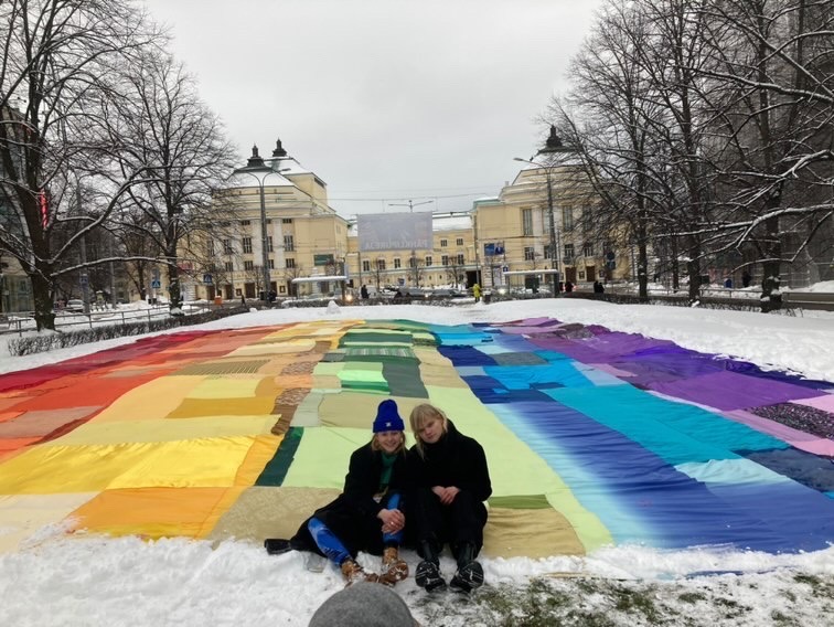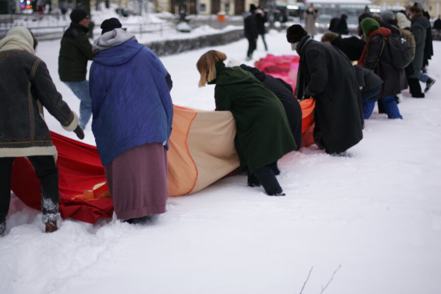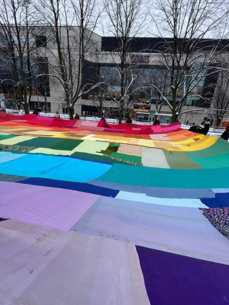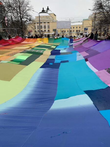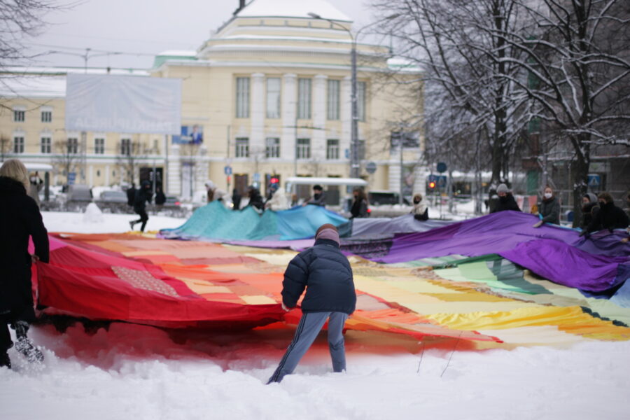 Mitmetest erisugustest kangajääkidest õmmeldud 23x13m suur ja 68 kilogrammi kaaluv vikerkaarelipp on EKA moedisaini osakonna tudengite Karl Joonas Alamaa ja Lisette Sivardi koostöös valminud teos. Töö sümboliseerib pilti ühiskonnast, kus kedagi ei jäeta kõrvale. Tervik ei pea olema ilus ja ühetaoline, vaid peab eelkõige püsima koos ning teineteist täiendama ja toetama. Lipp tõmmati aktsioonikorras lahti rahvamassiga 10. jaanuaril, Teatri väljakul. Inimeste koostöö oli oluline osa teose tähenduslikkusest, lisades lipule kui sümbolile reaalsete inimeste jõu ning panuse.