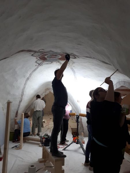 prof Hilkka Hiiop ja Vanalinna Hariduskolleegiumi noored konservaatorid Koeru kiriku võlvikute all. Foto: Järva Teataja