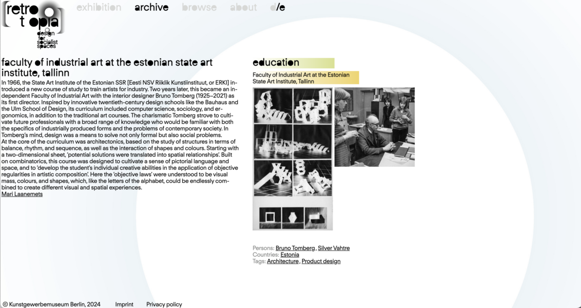 Esmaspäevast, 16. detsembrist 2024, on online 2023 Berliini tarbekunstimuuseumis toimunud näituse “Retrotopia. Design for Socialist Spaces” arhiiv.
