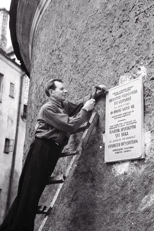 Hobuveskile arhitektuurimälestusmärgi sildi kinnitamine (1951-1954). Foto: Salomon Rosenfeld (EFA.357.0.90262)