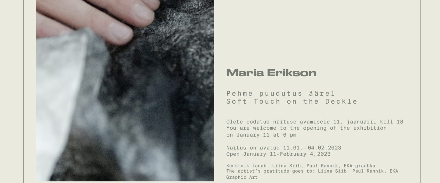 Näitusel „Pehme puudutus äärel“ vaatleb kunstnik enda suhet graafika protsessiga, millesse on kaasatud kunstniku keha ja litokivi. Võrreldes keha ja selle puutepinda litokivi pinnaga, otsitakse nendevahelisi paralleele ja vastuolusid. Omistades litokivile inimnahale omase võime mäletada, uurib Erikson enda loomingut kui kahe keha – kunstniku ja litokivi – vahelist dialoogi. Materjalide kokkupuute tulemusena kerkivad nende sarnasuste ja erinevuste kaudu esile kehade mittehierarhilised suhtlemisviisid ja uued koosolemise vormid.