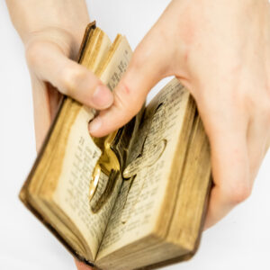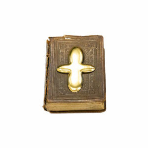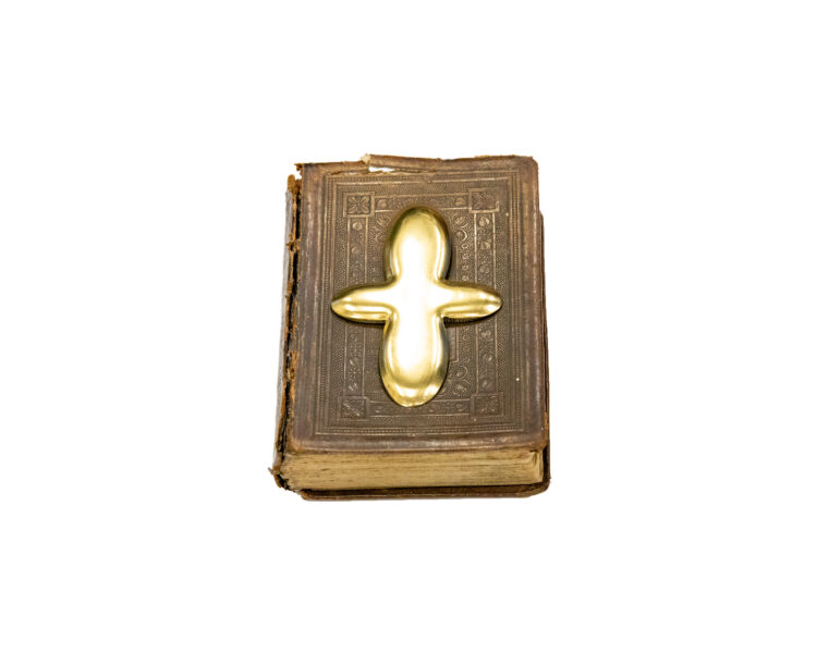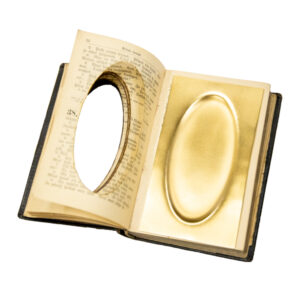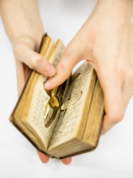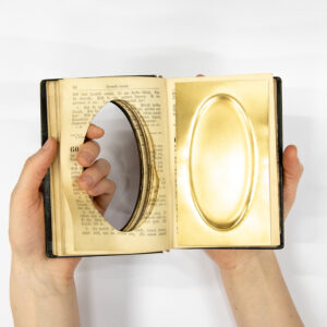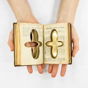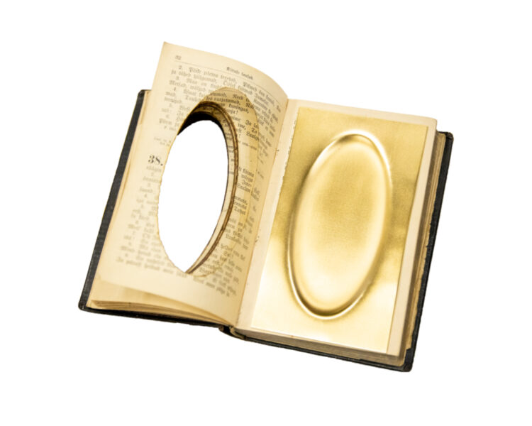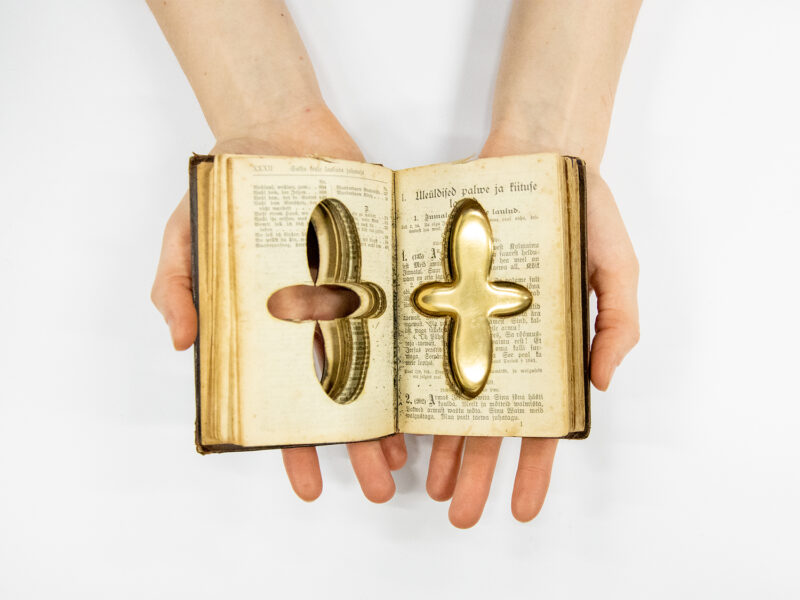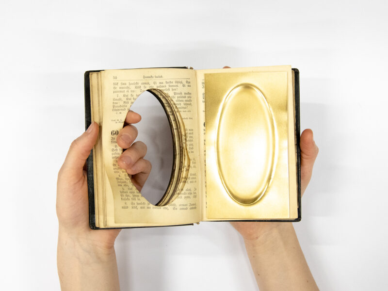 Laserlõikusega pressvormideks muudetud vanad piiblid ja lauluraamatud, millesse pressitud lehtmetall, muudab raamatud terviklikuks teoseks.