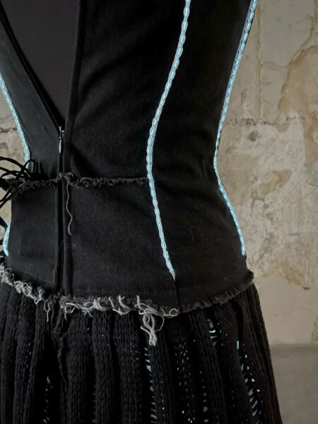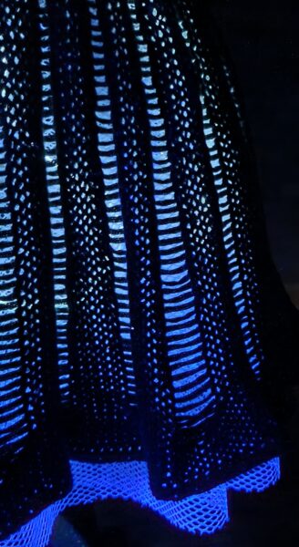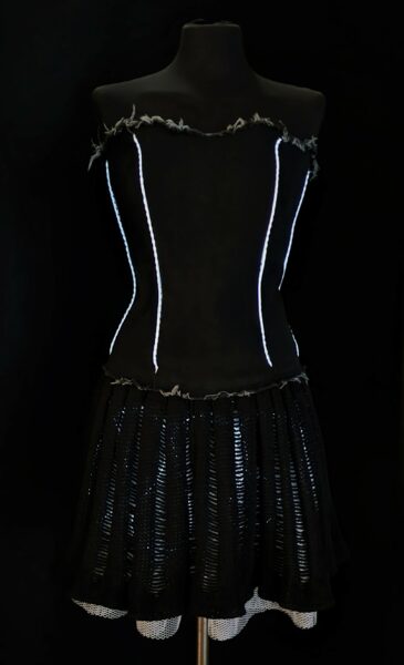Korsetti sai tehtud spetsiaalne tasku, kuhu on paigutatud adapter ja mille ribad jagunevad kleidi erinevatesse osadesse. LED-ribad jooksevad spetsiaalsete õmbluskanalite kaudu. Seelikuosa on kootud silmuskudumismasinal ning valgustus on põimitud alusseeliku kihtide vahele.