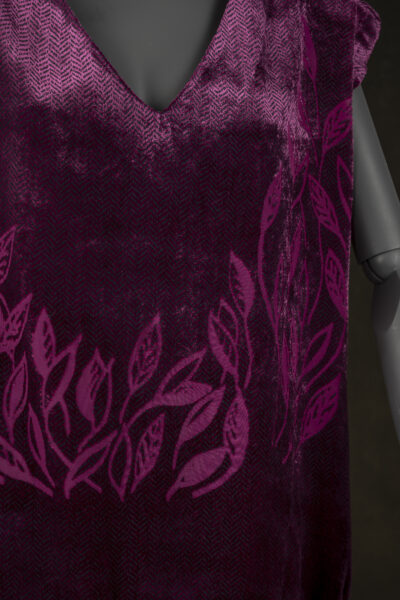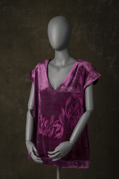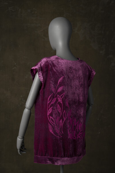 Materjali valiku juures jäin siidi/viskoosi juurde. Kui siiditrüki tundides tundus mulle parimaks värvivalikuks klassikaline must, siis mida rohkem oma ideed edasi arendasin ja mõtlesin, millist toodet ma reaalselt ise sooviksin kanda, seda rohkem tundus õige kasutada midagi erinevamat, kui klassikalised must või valge. Tundsin, et töö peab olema minule omase värvigammaga. Trükimustri motiivideks valisin kevadised tärkavad lehed, mis kanga värviga koos andsid tootele rõõmsa ja pisut ootamatu tulemuse.