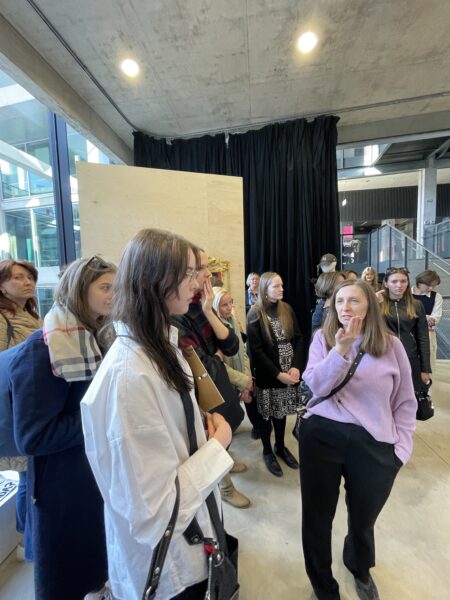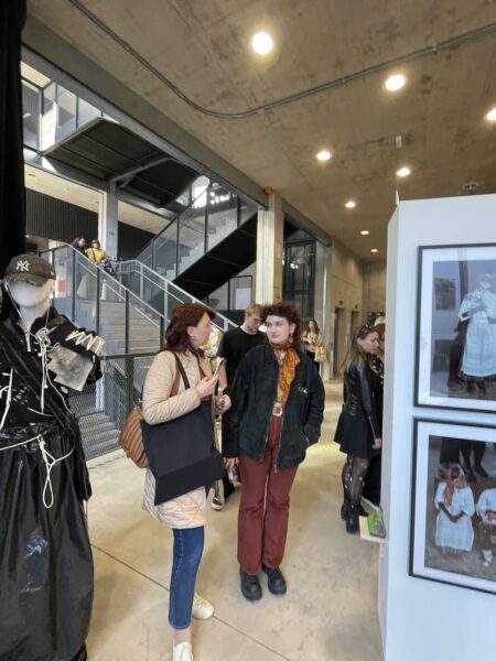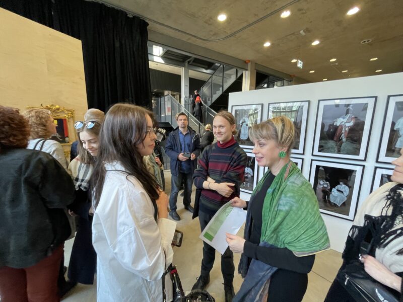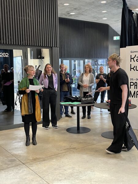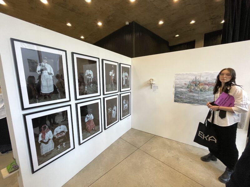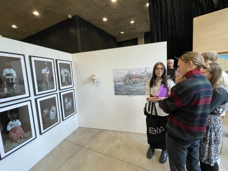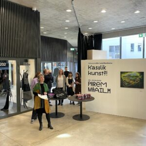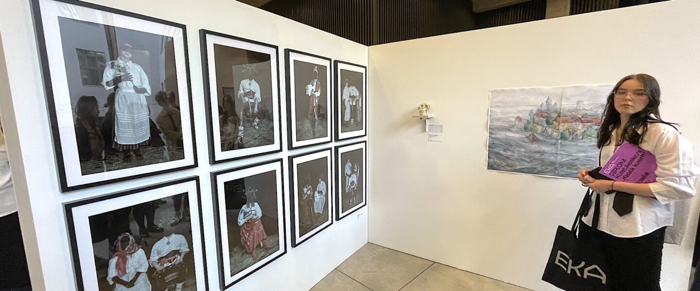Kasulik kunst?! 2023 konkursi üks võitjaid Claudia Olev oma töö "Rahvuskultuuri fetišeerimisest" ees. Foto: Andres Lõo